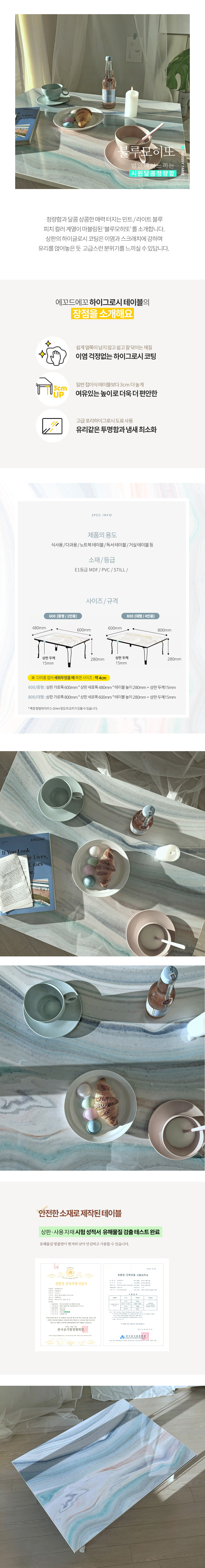 연블루, 소다, 피치, 화이트 등 다양한 컬러가 마블링되어 화사하고 산뜻한 분위기를 연출해주는 접이식 테이블입니다. 하이그로시 코팅처리 된 상판은 흠집과 이염에 강하며, 국내 생산 제품으로 높은 퀄리티를 자랑합니다.